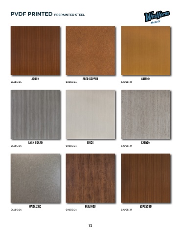 PVDF PRINTED PREPAINTED STEEL ACORN AGED COPPER AUTUMN GAUGE: 24 GAUGE: 24 GAUGE: 24 BARN BOARD BIRCH CANYON GAUGE: 24 GAUGE: 24 GAUGE: 24 DARK ZINC DURANGO ESPRESSO GAUGE: 24 GAUGE: 24 GAUGE: 24 12 13
