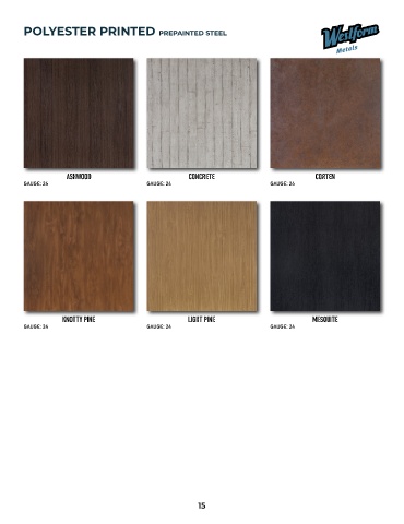 POLYESTER PRINTED PREPAINTED STEEL ASHWOOD CONCRETE CORTEN GAUGE: 24 GAUGE: 24 GAUGE: 24 KNOTTY PINE LIGHT PINE MESQUITE GAUGE: 24 GAUGE: 24 GAUGE: 24 15